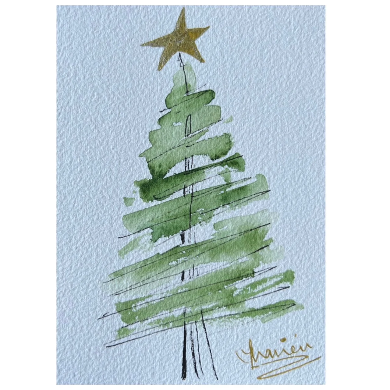 My Christmas trees this season is a fun selection of trees, with watercolor charm and just a splash of holiday mischief. Send one of these to friends, and enjoy a cup of of eggnog while writing them!