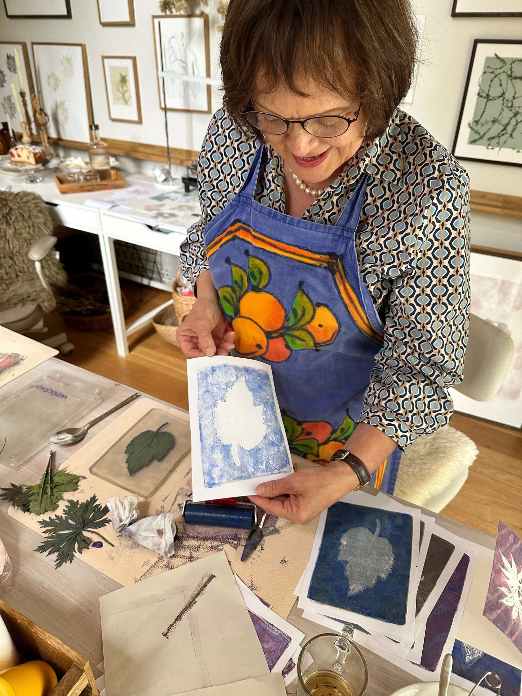 Gelatine printing, also known as gel printing or gelli printing, is a versatile and creative form of monoprinting that uses a gelatin-based printing plate. The technique allows for the creation of unique and layered prints with various textures and colors. Currently, I use leaves and flowers (both fresh and dried) in my prints, but I'm eager to experiment with other materials.